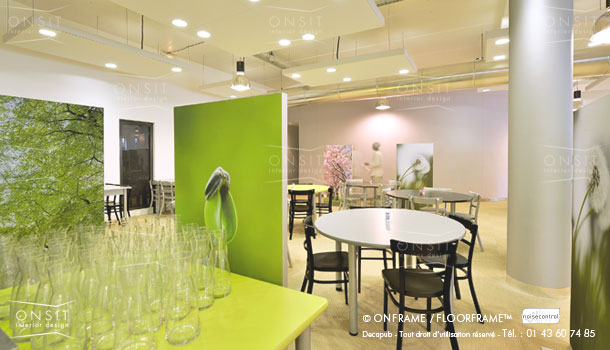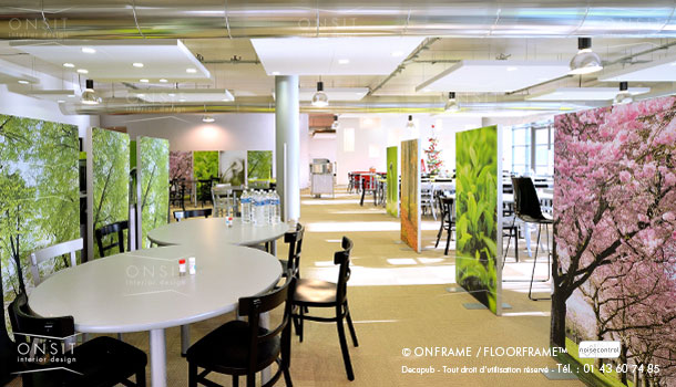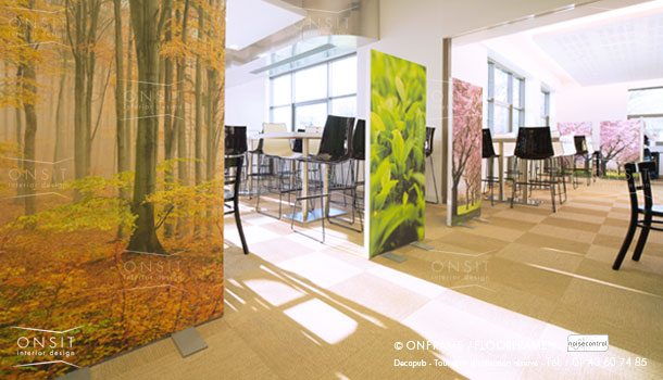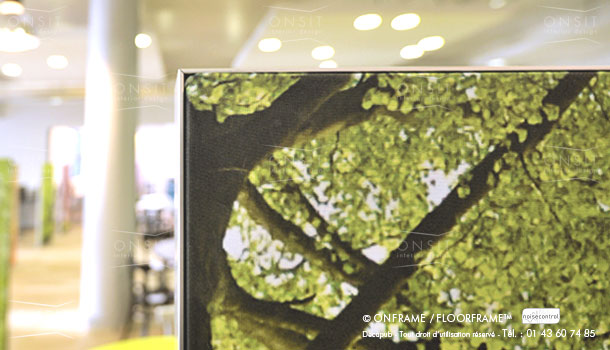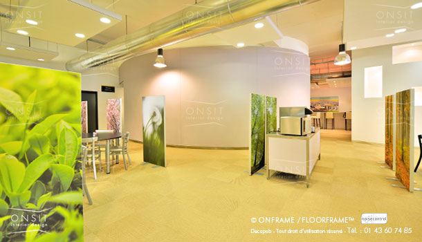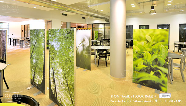 FLOORFRAMETM NoiseControlTM est un système de cloison ou paravent acoustique. Il permet de créer des séparations d’espaces en associant graphisme et réduction des nuisances sonores. Format et décor sur-mesure.![]() |