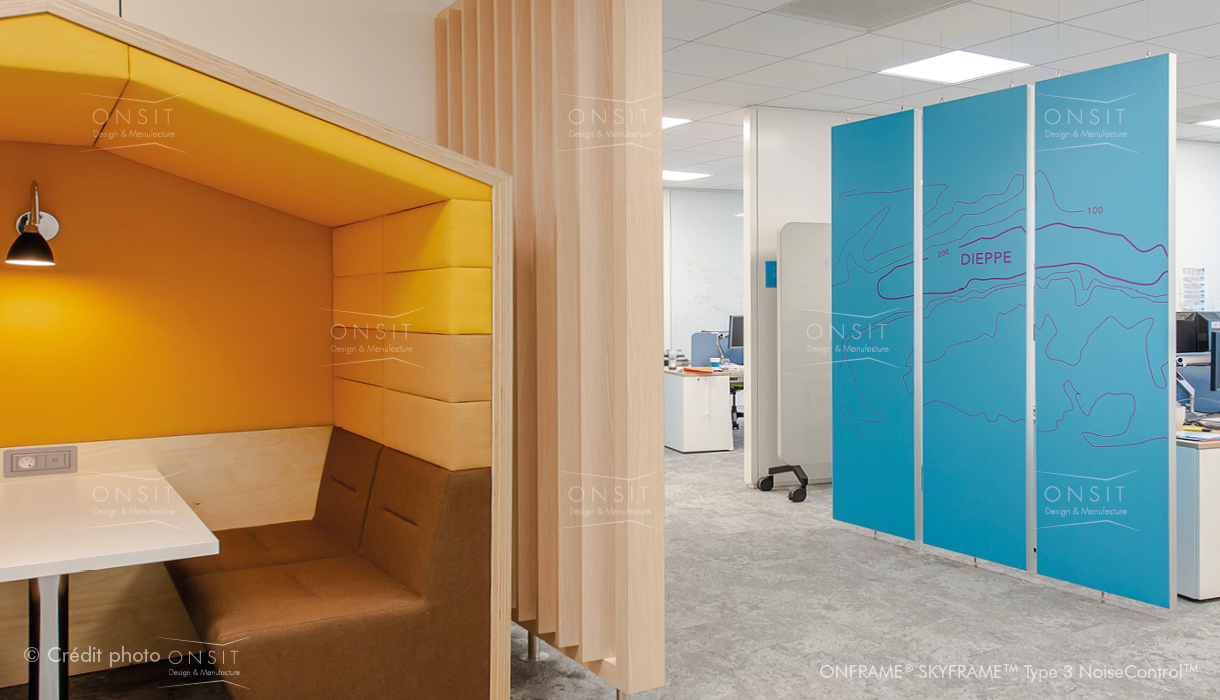 SKYFRAMETM NoiseControlTM est un système de panneaux suspendus. Il permet d’améliorer l’acoustique des espacesouverts type salle de conférence, salle de réunion, openspace, restaurant, circulation.