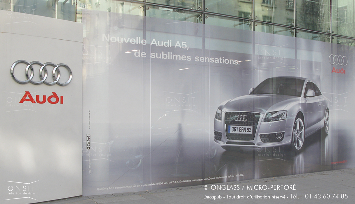 Solution de vitrophanie permettant la vision au travers du film depuis l’intérieur et la lecture du décor depuis l’extérieure Idéale en décor de façade.